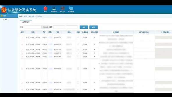 在考评管理上,针对牡丹江市两级人民法院实际情况,设计出了法院干警绩效考核系统,分为个人考核、部门考核、基层院班子考核等,建立起科学、公开、透明的绩效考评体系;结合“工作写实系统”强化内部管理,实行“日写实、周检查、月评议、季通报”的管理方式,要求干警根据自身岗位责任分工在写实评议信息管理平台系统中将履职情况及参加组织生活等情况真实、完整、精炼地加以记录,具体数据融入“一体化平台”中,实现系统数据互通;参照案件难易程度等标准,设置不同的权重系数,进一步提高案件评估工作的科学性,更加科学、合理地评价法官办案的实际工作量。案件权重系数不直接体现案件的办案质量、效率和效果,但可以较为科学合理地反映各基层法院、各业务战线和各位法官的实际工作量情况,可用于评估、测定一个法院、一个业务庭和一名法官的审理、执行案件所付出的实际工作量情况。各部门负责人可以登录一体化平台对本部门人员进行考核,由审管办进行最终考核,并进行考核结果展示。