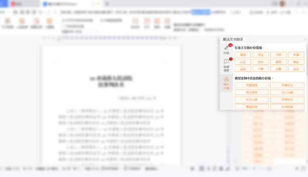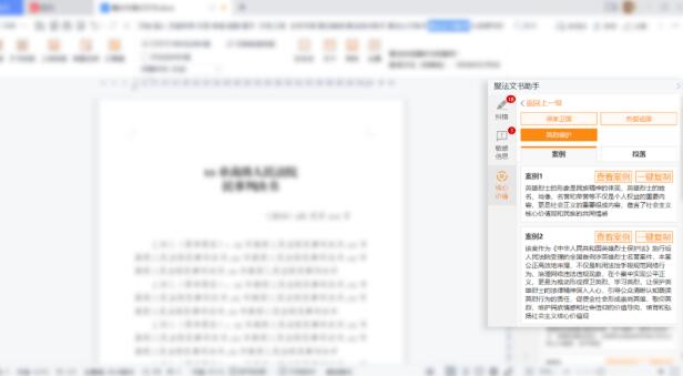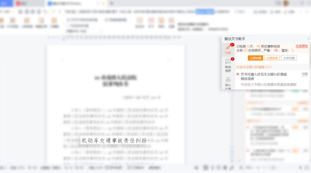 核心价值多维度分析:系统可智能提取文书中案由、案件事实、争议焦点、适用法律法规等内容,精准、全面地进行分析,并与裁判文书大数据分析结果进行比对。若文书内容涉及到社会主义核心价值观,将给予提示。