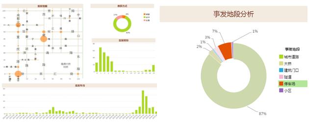1.时空维度。为了更加直观地呈现出案件发生地点的分布情况,我们根据实际地图建立了简化地图模型, 除了标注案发地点外,我们还利用热点图突出显示相应地点下的案发数量的方式,借此建立案发地点与案发数量之间的联系。除了案发数量以外,地图还关联了其他的关键数据,当选定某一地点时,可以实现动态查看该地点下的整体案件数量、不同案发时段下的案件数量以及相应查获方式下的案件数量等等,以地点为基础,全面反映了各要素之间的关系。经过数据关联以及可视化处理后,我们可以得到醉驾案件案发组图。从图片中我们可以观察到,醉驾案件的案发地点较为集中,查获的方式以设卡为主(占比达到80%),案发时段与年月均有峰值特征。据此,我们可以初步还原最多的案发场景:即2019年1月至9月,晚23时至凌晨4时,在徐家汇路鲁班路、西藏路宁海路等几个路口。同时,通过提取案发地段,我们进一步发现,除了城市道路(占比达到87%)以外,发生在停车场 的案件也占有一定比重(占比达到7%),这一数据带给我们积极参与社会治理的新启示。