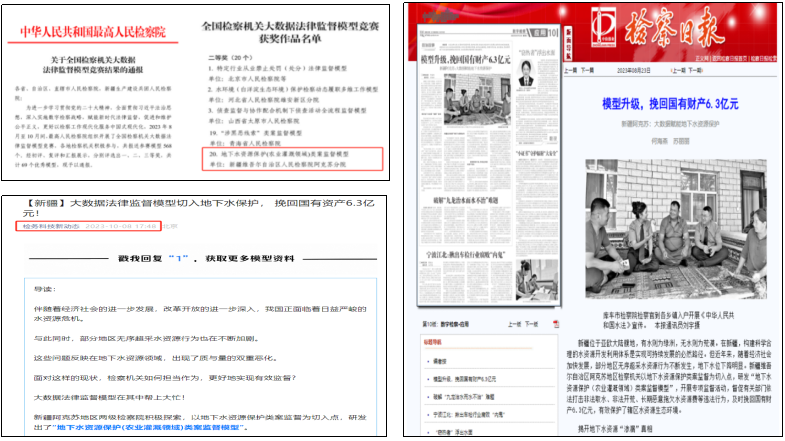 一是挽回重大国有财产损失。2023年以来,通过大数据法律监督模型推送类案监督线索,共追回国有财产损失2.27亿元。其中,“地下水资源保护(农业灌溉领域)类案监督模型”,仅库车市院督促相关单位追回国有财产损失1.3亿余元;利用“残疾人就业保障金类案监督模型”,分院督促地区行政、企事业单位缴纳入库残保金7826.37万元,促进残疾人就业985人。通过“违规领取社保资金(养老金、低保)监督模型”分析出阿克苏市域范围内违规领取社保资金线索1163余条,追缴国有财产损失154万余元。2024年利用“排污许可法律监督模型”,推送无证排污线索6691条。二是大数据法律监督模型获得全疆、全国奖项。2023年,选送的13个模型参加全区检察大数据法律监督模型竞赛,获得1个一等奖、1个三等奖,6个优秀奖和1个优秀组织奖,共9个奖项的好成绩,其中,获得全区一等奖的“地下水资源保护(农业灌溉领域)类案监督模型”荣获全国检察机关大数据法律监督模型竞赛二等奖。三是地下水资源保护经验成效明显。利用“阿克苏检察机关大数据法律监督指挥平台”研发出“地下水资源保护(农业灌溉领域)类案监督模型”,2023年以来,挽回国有财产损失1.3亿元,2023年8月23日,检察日报头版刊登了阿克苏检察机关地下水资源保护的先进经验。2023年9月19日、9月27日,“新疆法制报”、“新疆检察”分别刊登了“大数据赋能法律监督 做好护水‘大文章’”的先进经验。