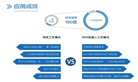 案管业务长期呈现出点多面广线长,传统的监督模式,载荷已经达到了峰值,推力已经达到了极限,亟需向科技要生产力,打造新引擎,增加新动能。传统的工作模式,一名检察官工作8小时,一天大概能够审查30件左右一审公诉案件,案管小智上线以后,利用流程自动化技术, 24小时工作,一天能够审查的案件是4800件左右,效率提升160倍,为案管全面监督、深度监督和科学监督找到突破口。案管小智全方位、全生命周期工作推动了案管工作高水平发展,摆脱之前完全依靠人工处理容易形成错误和遗漏的状况,用现代科技为检察官职业风险筑建“防火墙”,避免负面舆情事件的发生。