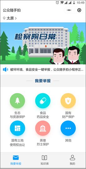 小程序共分3个模块,我要举报、知识库和个人中心。群众点击要举报类型,如:生态与资源保护,进行举报。