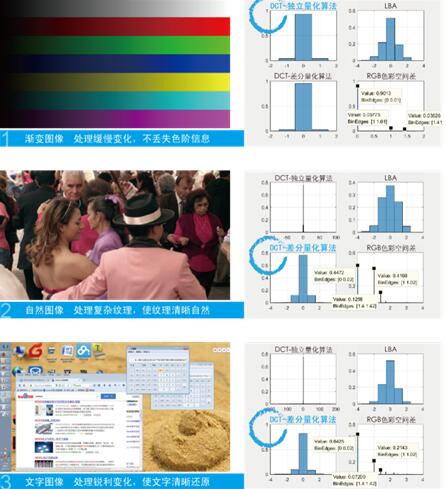 浅压缩技术是将传统的视频信号,经过5-10倍的轻量级压缩,转换成300M-900M的网络码流,同时满足无损画质、超低延迟,给客户极致的使用体验。不同的视频图像,例如自然景观图像、多文字图像、渐变色图像,具有不同的频域特性,小鸟科技采用自主知识产权的DBMC(DIGIBIRD MultiStreaming Coding)多引擎视频压缩算法,将三种核心浅压缩算法进行完美融合(LBA、DCT-独立量化算法、DCT-差分量化算法),根据视频图像内容和网络传输带宽,自动选择最优的压缩算法,实现视频图像的无损压缩和传输,达到最极致的画质体验。