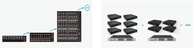 传统方案中,最大规模的矩阵也只有数百路,不得不通过多台设备级联来实现大规模信号切换,操作复杂,易用性差。采用分布式系统,通过交换机的堆叠,接入任意数量节点,不受系统规模限制,轻松完成上千路信号的系统搭建和共享切换。