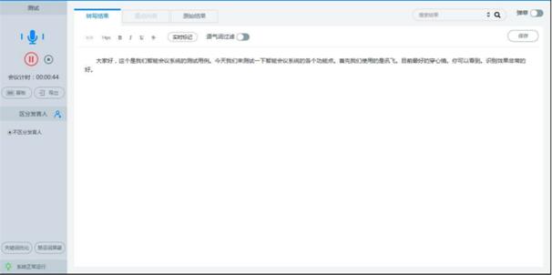 系统通过专业麦克风对会议全程进行高保真录音,并针对连续中文语流进行实时语音转写识别,并持续进行转写结果文本内容的输出。