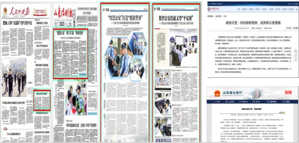 平台自上线以来,受到政府和群众的一致认可和好评。省公安厅、大数据局、威海市人民政府等政府部门均发文宣传和推广AI数智警察,表示其充分发挥科技创新的引领作用、为警务一线工作提供有力支撑。中国警察网、大众网、齐鲁壹点、山东法制报等众多媒体也多次发表相关报道。