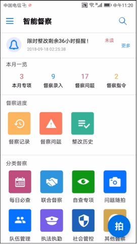 主要功能:在系统中设定队伍管理、执法执勤、社会面管控等4大类、18个小类,共400条问题标准,统一量化督察问题标准。为突出实战、简化操作,界面定制“一健拍”快捷操作,现场督察时,一键点击快速拍录现场照片、音视频,可使用语音识别录入检查内容,全程无需打字。同时,通过安全可控接口连接便携式打印机,现场生成检查报告,提高现场督察工作效率。开展专项督察时,APP从督察立项、审批、实施、问题整改、反馈、处置等工作流程到自动生成督察通报,全部在APP上呈现,节约了时间和警力资源。多警种联合督察时,可进入联合督察模块,由督察部门发起联合督察,赋予相关警种督察权限,共同开展检查,督察问题自动汇总生成问题清单,自动形成督察通报,参与警种实时掌握督察进程,避免重复检查、多头检查。通过每日必查模块,上传问题清单,督察部门每日审核,每月评估分析,APP系统采集的问题短板、薄弱环节,都反映在各级领导的警务通上,实现监督过程全透明。智能督察APP系统后端统计分析功能,按照问题类型、数量、部门等数据汇总统计、分析比对,以图表形式体现问题发生概率,实现队伍和执法的精准化“靶向"督导管理。