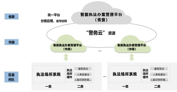 结合实际情况,以“警务云”资源为主,传统服务器为辅,可以进行省、市两级部署,为省、市各自管辖范围内的执法办案管理中心提供软件功能应用,以及完成与两级管理平台间的数据交换和业务协同
