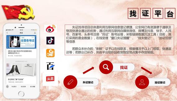 全国失证找寻公众平台(找正证)总体是利用互联网信息登记便捷、公安网已有资源便于通联及物流快递业通达的优势。通过利用互联网自媒体微信、微博及抖音、快手、人民号、百家号、头条号注册“找证”账号运维,采取链接数据沉淀工具,在线受理“窗口失证提醒”、“挂失登记”、“拾证招领”等信息。若群众未补办的“新鲜”证予以在线联系,根据情况予以上门领取、快递返还等;若群众已补办,则由平台组织回收到指定地点集中存放销毁。