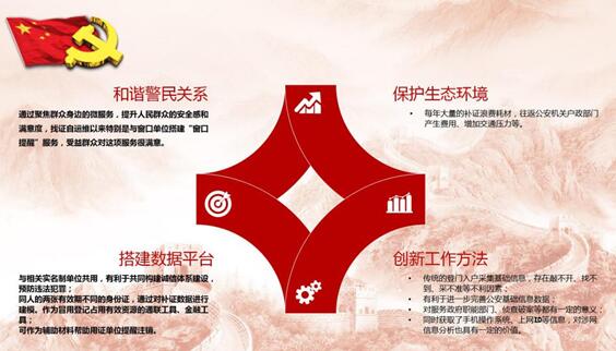 项目创新性在于利用大数据采集数据、物流寄递业发达等优势,利用群众普遍使用的微信、微博、抖音、头条号、人民号等自媒体平台,广泛宣传运用,最广范围、最大限度地收集盗失证件信息。产生的数据信息能有效反补公安基础数据,服务侦查破案和社会管理;通过一定范围的共享公安户政补证数据,能与实名制行业单位形成互补,有效支撑诚信体系建设。