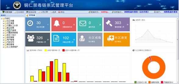 铜仁禁毒链条式管理系统平台由公安管理系统、社会化管控系统、人员电子监管系统和启新关爱APP四套子系统68个应用功能模块组成。系统充分整合了公安禁毒部门和禁毒社会资源各类数据,搭建了公安内部各相关警种与社会禁毒各相关力量之间的协作桥梁,不仅大大降低了对吸毒人员的管控难度,还极大的提高了禁毒民警的工作效率,实现了毒品犯罪从立案侦查、案件告破到移送审查起诉的完整打击链和吸毒人员查处、场所戒治到社区戒毒社区康复、就业安置、回归社会的完整管控链。鉴于公安管理系统和人员电子监管系统为公安机关内部系统,这里只作简要介绍。