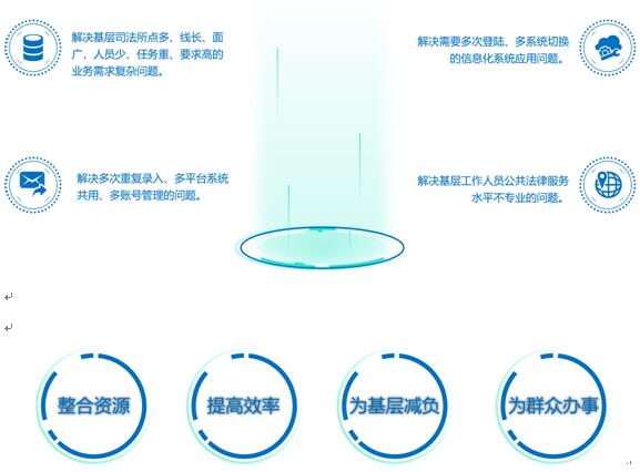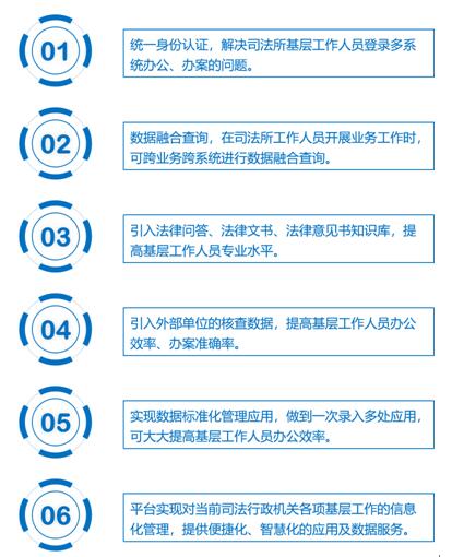 针对基层司法所点多、线长、面广,人员少、任务重、要求高等实际特点,以及现有业务应用系统,需要多次登陆、多系统切换、多次重复录入、多平台系统共用、多账号管理的应用现状,以整合资源、提高效率,为基层减负、为群众办实事为目标。