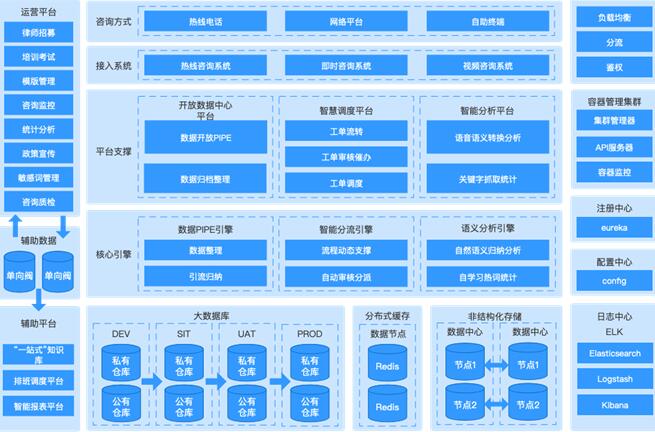 “百事通”一站式智能综合法律咨询平台主要由综合咨询(即时咨询、热线咨询、视频咨询)、数据中心以及智慧工单调度几大模块组成。其核心的业务系统架构如图: