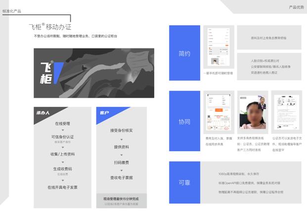 2.飞柜办证业务,利用技术手段拓展了公证服务的服务半径,让公证员能够仅使用移动设备即可完成身份证识别、人脸识别、信息录入、资料采集、电子签名等步骤,极大的提升了工作效率。