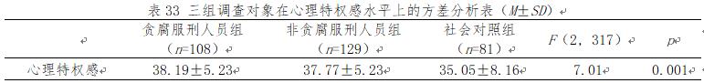 心理特权感的研究结果表明,在三组研究对象中,贪腐服刑人员组的心理特权感水平最高,并且差异性具有统计学意义。这一结果佐证了自恋人格部分的结果,说明在贪腐服刑人员的观念中,认为自己应该受到优待,存在被夸大的权利感。