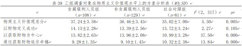 物质主义价值观的研究结果表明,相比于社会对照组,贪腐服刑人员组和非贪腐服刑人员组更倾向于拥有物质主义价值观,具体表现为贪腐服刑人员和财产型服刑人员均倾向于以获取财物为中心,而社会对照组更倾向于通过获取财物来追求幸福。也就是说,贪腐服刑人员和财产型服刑人员在物质追求的层面更突出唯利是图的特点,社会对照组主要表现为将财富与幸福感体验联结在一起。