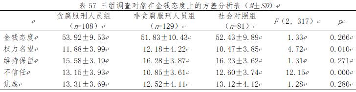 对三组调查对象在金钱态度量表上的得分进行描述性统计以及方差分析,结果显示,三组在金钱态度总分以及分维度维持保留和焦虑的得分上差异均不显著,但在分维度权力名望(F(2,317)=4.72,p=0.010)、不信任(F(2,317)=12.15,p=0.000)的得分上差异显著。