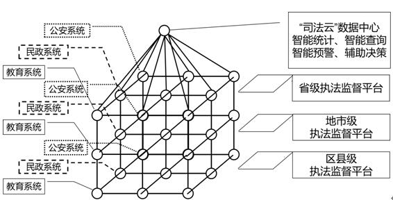全面、整体、细化行政执法监督体系,首先需要把部省市县四级行政执法监督机构与40余类四级行政执法机构通过遍布全国的电子政务外网和电子政务外网无线接入功能联通起来,解决“道路”通不通的问题。融合基于业务垂直管理的执法监督体系和基于水平执法监督的执法监督体系的优势,构建起横向到边,纵向到底的执法监督网络体系。形成以“司法云”为中心的立体化行政执法监督体系,在公安系统、民政系统、教育系统等40余个行业系统中实现业务垂直指导、标准统一执行、流程统一规范、文书统一格式、裁量统一阈值,在省级、地市级、区县级水平层面实现政府执法监督部门对本层级执法部门所有执法事项进行监督、评查、比较、排名,构建起本地政府的法治建设数字画像,为本地党委政府依法治理提供决策支撑。基于数据共享的立体化行政执法监督体系示意图如图2所示。