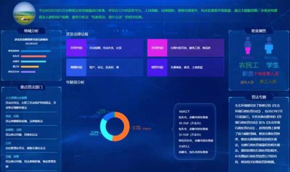 “智慧普法”平台,实时抓取全网涉法信息,汇聚立法、执法、法律服务数据,按月对涉法内容传播途径、传播效果、覆盖人群、覆盖地域进行精准分析,综合得出普法需求高频地区、人群属性、高发涉法事件、高需求法律领域等,用信息化手段推进精准普法,加强普法宣传针对性、实效性。将“谁执法谁普法”普法责任清单、各地区不同时节重点普法清单纳入平台,与涉法、立法、执法、法律服务数据多维度关联分析,对应得出重点普法部门、普法专题及新颁布实施的法律法规规章普法宣传预警,及时发布《每月普法重点指引》,适时动态调整普法方向,推动形成各部门分工负责、各司其职、齐抓共管的大普法工作格局。