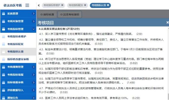 建立“谁执法谁普法”普法责任制常态化考核机制,将“谁执法谁普法”普法责任制落实评估21项指标纳入平台,在线配发指标、认领指标、全网抓取指标落实情况,定期评议赋分,自动生成评议结果,展示各普法责任单位“谁执法谁普法”普法责任制落实情况,应用大数据考准考实普法工作成效,丰富拓展“谁执法谁普法”闭环管理机制。