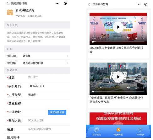 平台对接珠海司法微信公众号平台、珠海法律在线,实现对外新法速递、以案释法案例统一宣传与管理。全市各单位通过平台提前创建普法活动信息,发布活动预告和报名人数等内容,参与者通过平台在珠海智慧司法小程序亦可同步进行宣传展示和报名。