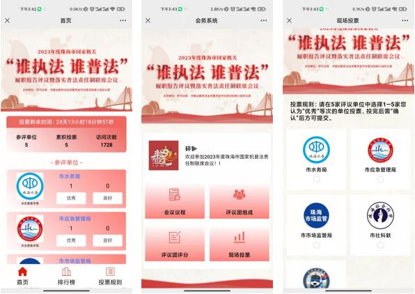 落实“谁执法谁普法”责任单位履职报告评议活动,针对社会评议参与人数高,普法宣传推广量大,考虑安全等问题,系统通过用户认证、IP限制等手段,防止刷票、恶意投票行为发生,保障年度国家机关“谁执法谁普法”履职报告评议活动公平有效地开展。使用该投票系统进行网络投票,将进一步实现全市统一评议方式标准,实现普法资源最大化利用。