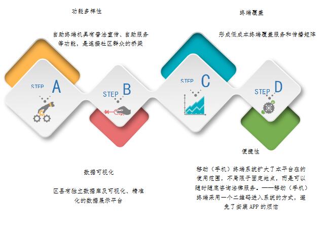 智慧司法终端服务系统为全国区县司法局提供数字化法律服务管理手段和精准普法宣传平台,为本地群众提供最便捷、最经济、最高效、最亲民的“指尖上的公共法律服务”,打造最贴近广大老百姓的主流法宣阵地,打通智慧普法和公共法律服务“最后一公里”。实现法援和普法大数据的本地化存留,助力基层构建符合国情、线上线下相结合的新型公共法律服务和精准普法体系,服务我国数字法治建设。
