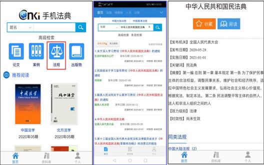 《CNKI手机法典》收录各效力级别法律法规、刑民行各领域司法案例、各部门法论文知识三类资源,通过手机、平板等移动端的实时更新,满足普法工作者非办公环境下查询法律知识的需求,并提供机构内部原有移动端系统对接服务,可实现一键登录,办公、学习两不误。