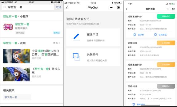 构建以微信小程序、门户网站为主的全时空在线调解服务平台,社会公众可随时随地提交调解申请,可查看当前调解进度、享受即时调解服务,实现“不出家门、在线解纷”。