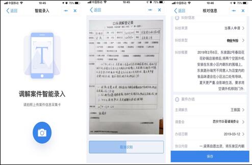 研发微信小程序“调解小能手”,为调解员外出开展调解工作、记录案件提供技术支持。“调解小能手”通过集成证件识别、语音识别等智能化应用,支持调解员在外出调解过程中,通过手机拍照快速识别证件信息,语音输入录入案件信息,减少业务人员信息录入量,不断提升调解工作效率。