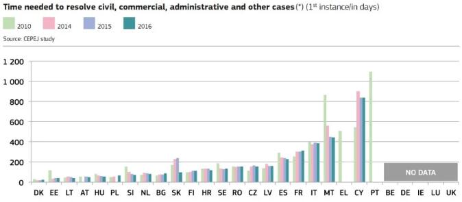 2018年“欧洲司法记分牌”显示,在法院案件的裁决速度方面,主要是解决民事和行政争议的速度方面,爱沙尼亚(EE)仅次于丹麦(DK),位居第二。