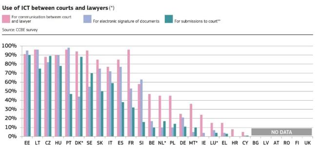 2018年“欧洲司法记分牌”显示,爱沙尼亚(EE)90%以上的信息是利用信息技术工具在法院和律师之间进行的,这一结果也让其在记分牌上的该类指标中排名第一。